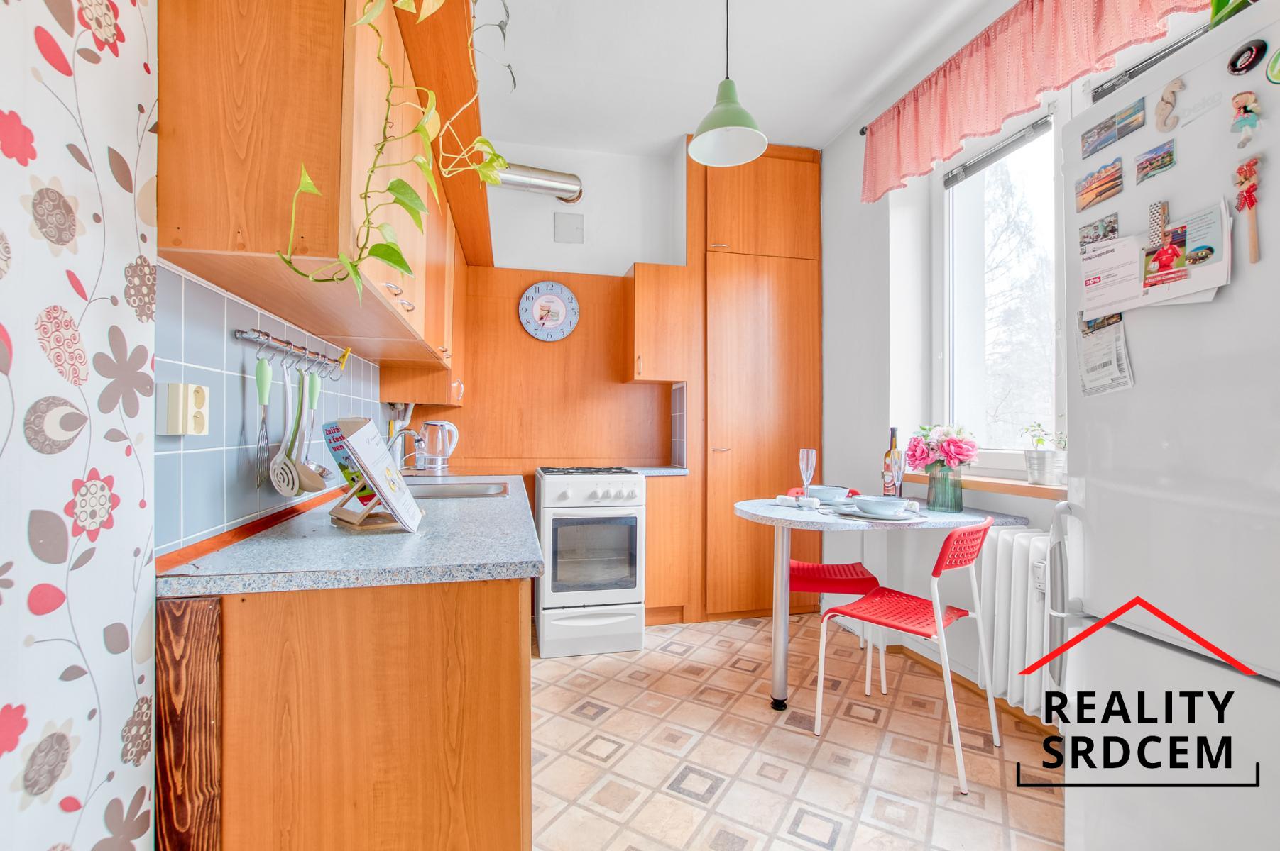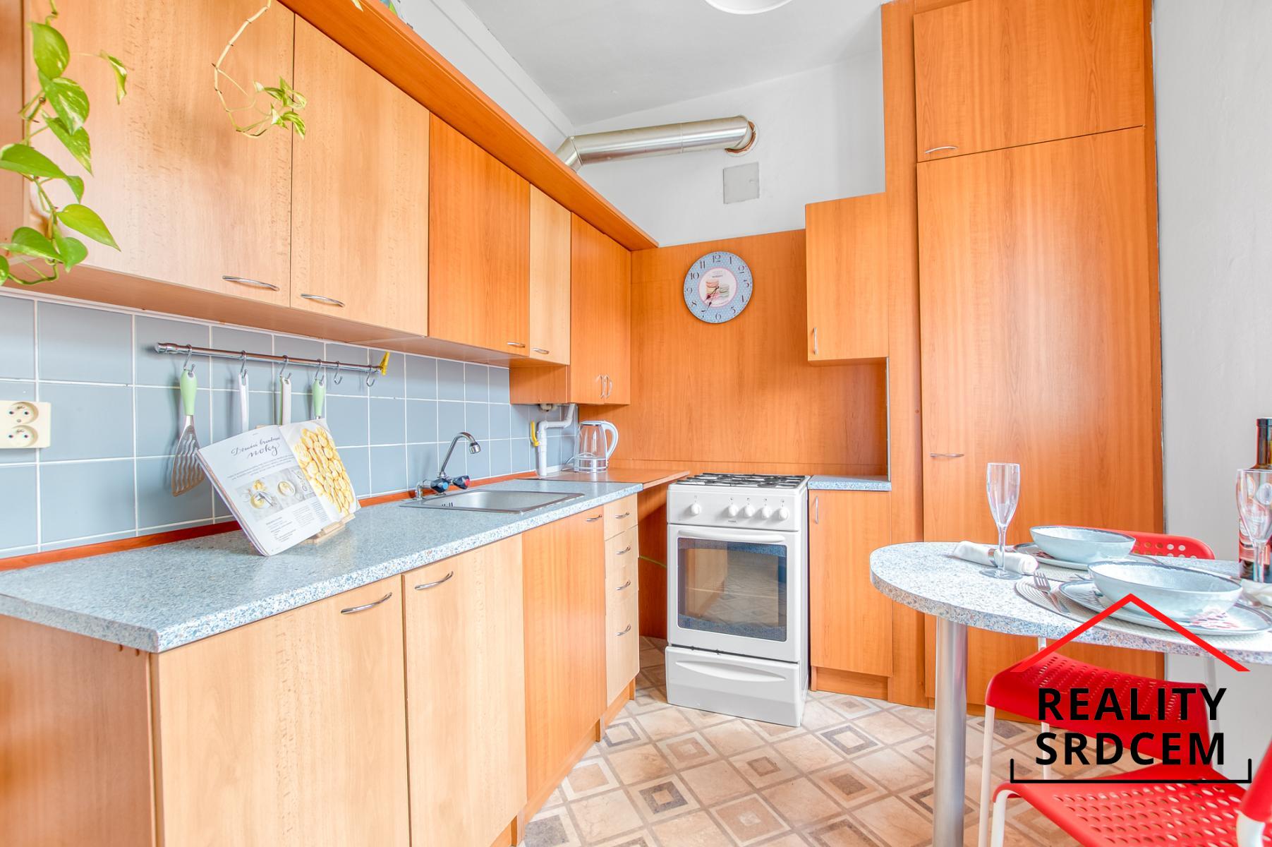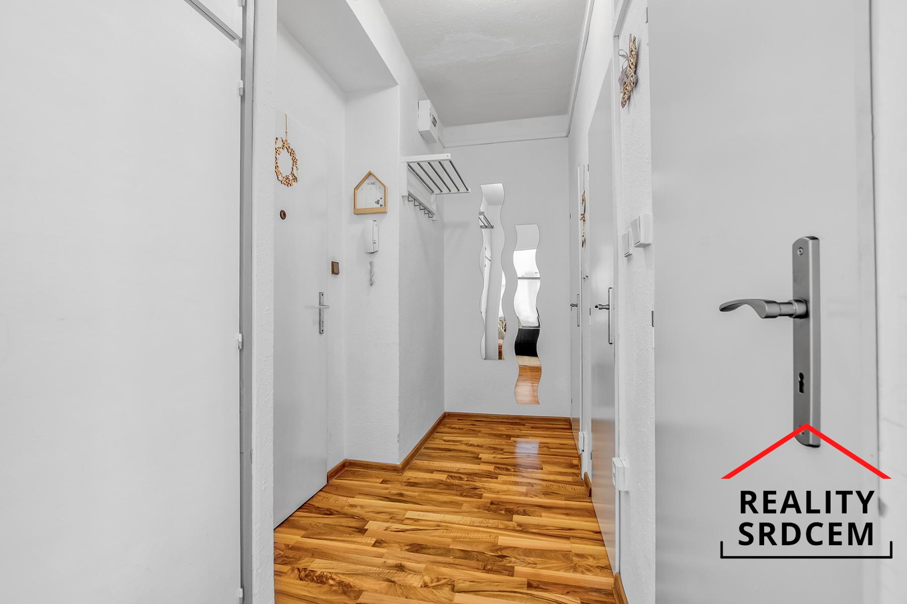 Byt prošel částečnou rekonstrukcí - původní jádro bylo obloženo keramickým obkladem, částečně nová elektroinstalace, na podlahách položená plovoucí podlaha, v kuchyni pvc a v obývacím pokoji na parketách položený koberec. V předsíni se nachází samostatné wc, koupelna s vanou a šatna, obývací pokoj je průchozí do kuchyně. V kuchyni je zánovní kuchyňská linka s plynovým sporákem, ohřev teplé vody zajištěn přes průtokový plynový kotel. Byt se prodává bez vybavení.