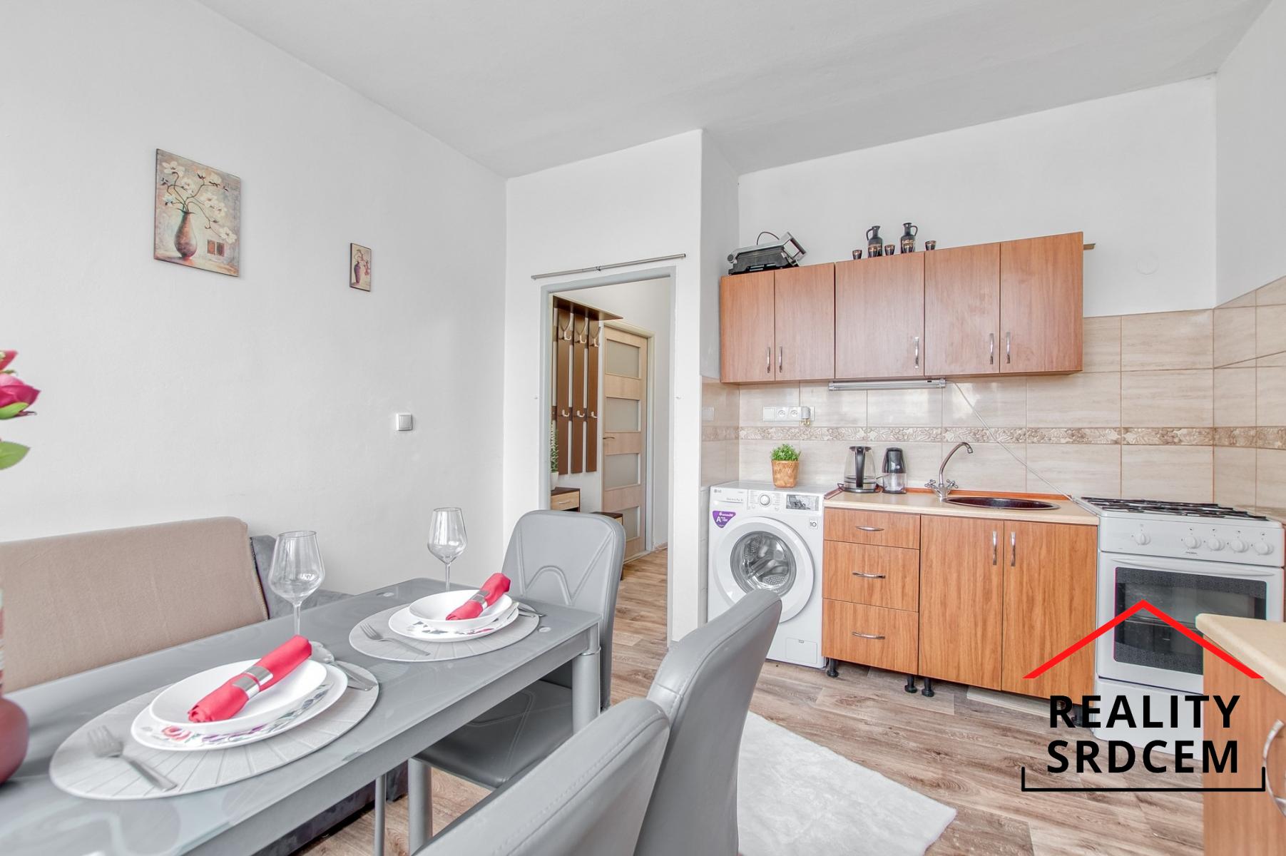 Novější kuchyňská linka včetně plynového sporáku, lednice, pračky, mikrovlnné trouby, dále je kuchyň vybavena menší sedačkou, stolem se 4 židlemi, nádobím.