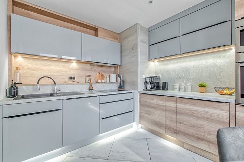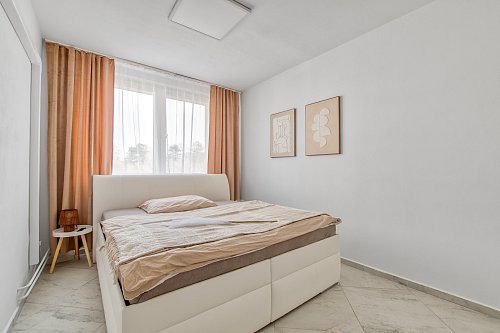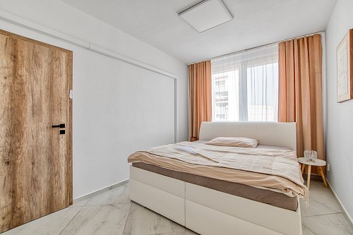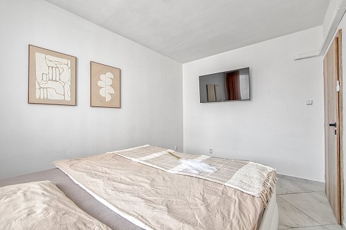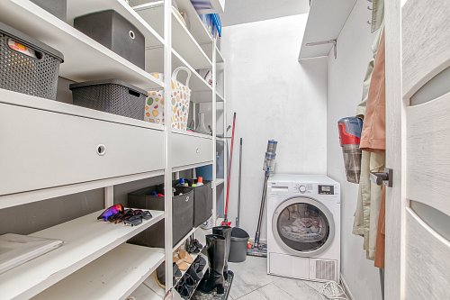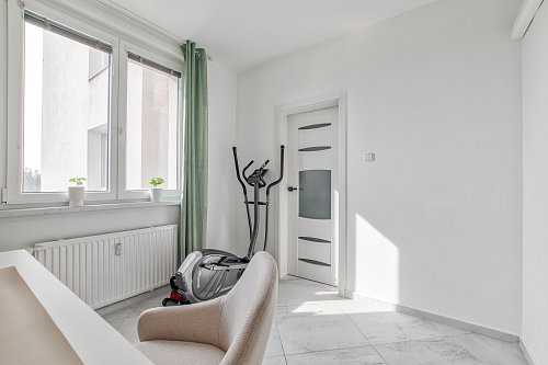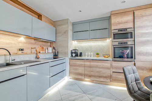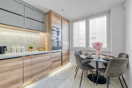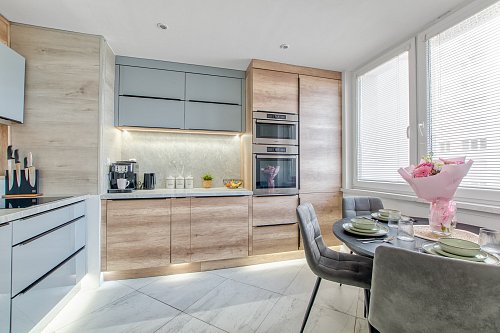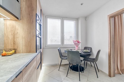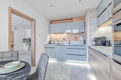 Dominantou bytu je moderní kuchyňská linka vyrobená na míru, která je vybavena vestavěnými spotřebiči a poskytuje dostatek pracovního i úložného prostoru. Praktickým benefitem je také samostatná šatna, která výrazně zvyšuje komfort každodenního bydlení.